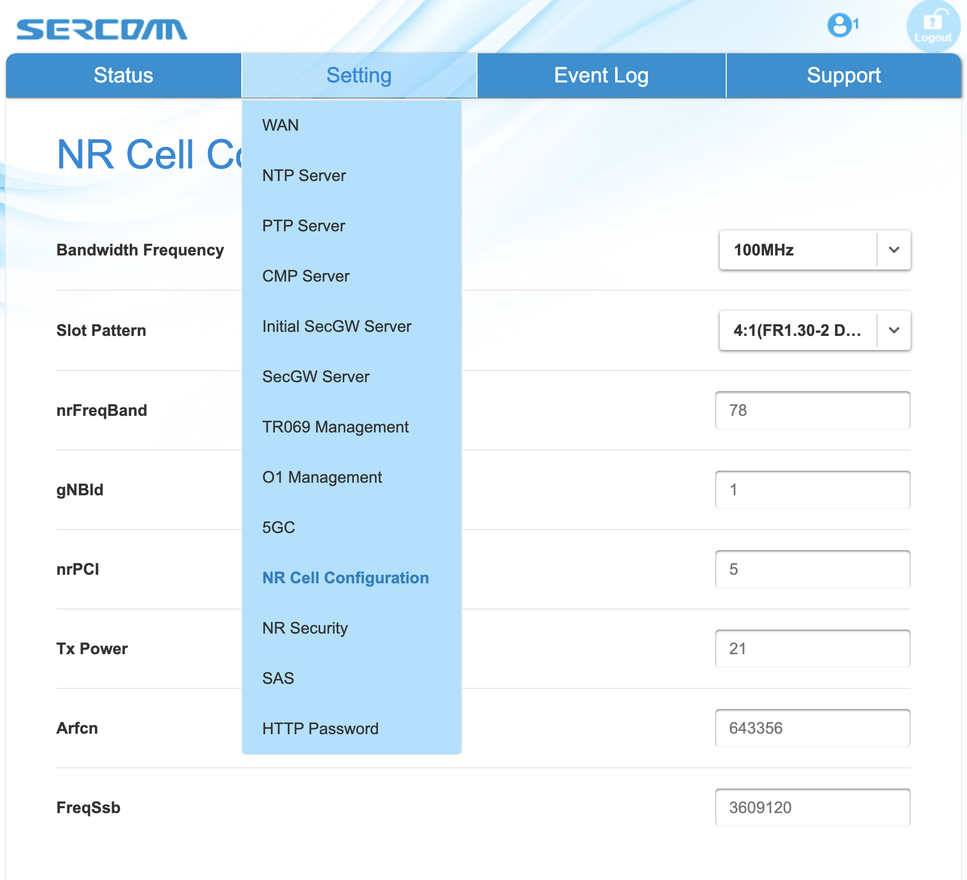 Figure 9. Management dashboard on the Sercomm gNB, showing the dropdown